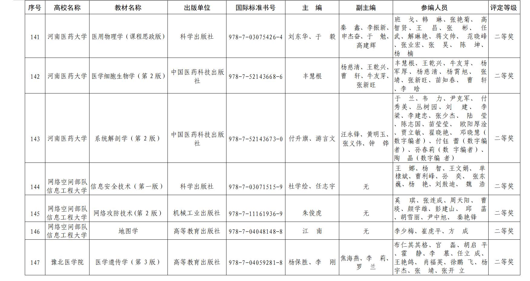 近日,河南省教育厅办公室发布《关于公布河南省教材等级评定结果的通知》(教办思政〔2025〕259号),我校基础医学院杨保胜教授主编的《医学遗传学(第3版)》丰慧根教授主编,张靖副教授参编的《医学细胞生物学(第2版)》、苗莹莹副教授参编的《系统解剖学(第2版)》、班戈副教授与陈坤老师参编的《医用物理学(课程思政版)》等四部教材荣获高等教育类二等奖。这一成果体现了我校在教材建设与教育教学改革方面的持续投入与显著成效,是对我校教材编写质量、课程建设水平以及教学改革成果的高度肯定。