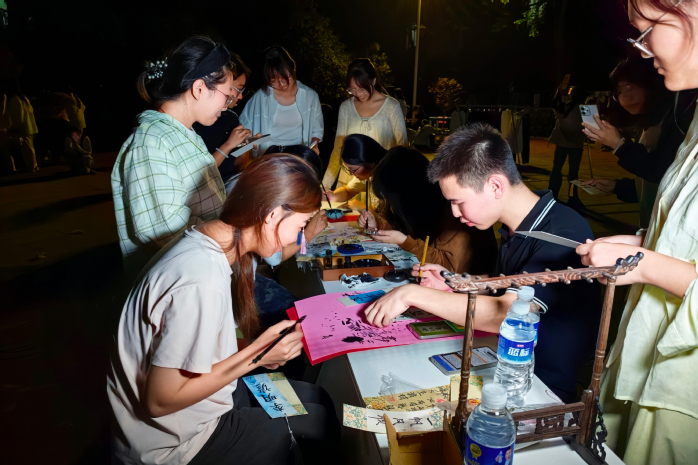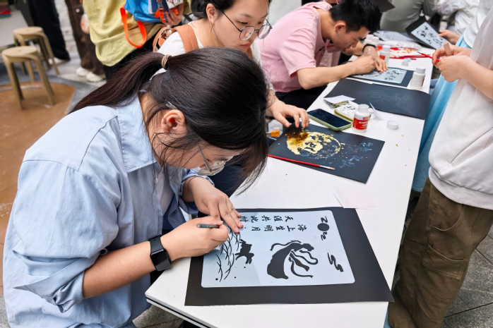 书法创作区内墨香萦绕,同学们凝神聚气,悬腕运笔,在宣纸上一撇一捺地书写着古韵诗文。活动现场气氛庄重而雅致,唯有笔尖与纸张摩擦的细微声响,仿佛一场与古人对话的精神修行。“当你提起笔,所有杂念都需要放下,心思全部凝聚在笔锋的流转之间。这不仅是写字,更是一种精神的放松和意志的磨练。”参与者安磊感慨道。书法艺术源远流长,讲究“心正则笔正、笔断意连、气韵生动”,其核心在于调息、静心、达观,是历代文人修身养性的重要途径。