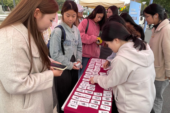 汉字拼字区前排起长队,同学们跃跃欲试,想在方寸汉字间一展身手。“原来,‘朋友’是月下并肩而行;而‘怒’是心被奴役……”助产专业张豪格同学在拼完汉字后感慨道。活动负责人表示:“汉字拆解与重组的过程,本质上是引导学生梳理情绪、关照内心的过程,能让大家在潜移默化中放松身心,开启一场沉浸式的心灵疗愈之旅。”