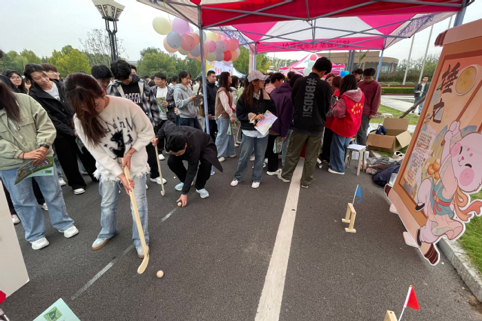 捶丸体验区活力洋溢,同学们手持球杖,凝神瞄准,稳步挥杆,专注于将球击入目标洞穴,充分展现出这项传统运动动静结合的独特智慧。“这可不是简单的打球,瞄准的时候必须全神贯注,特别能锻炼专注力。”检验专业郑一鸣完成挑战后说道。捶丸源自唐代步打球,在《丸经》中有详细记载,其讲究“控己、谋局、平衡胜负”的特点,成为古人修养心性的“心理训练工具”。如今,通过现代校园体验的形式,这项古老运动得以焕发新生,助力学生提升情绪管理能力与心理韧性。