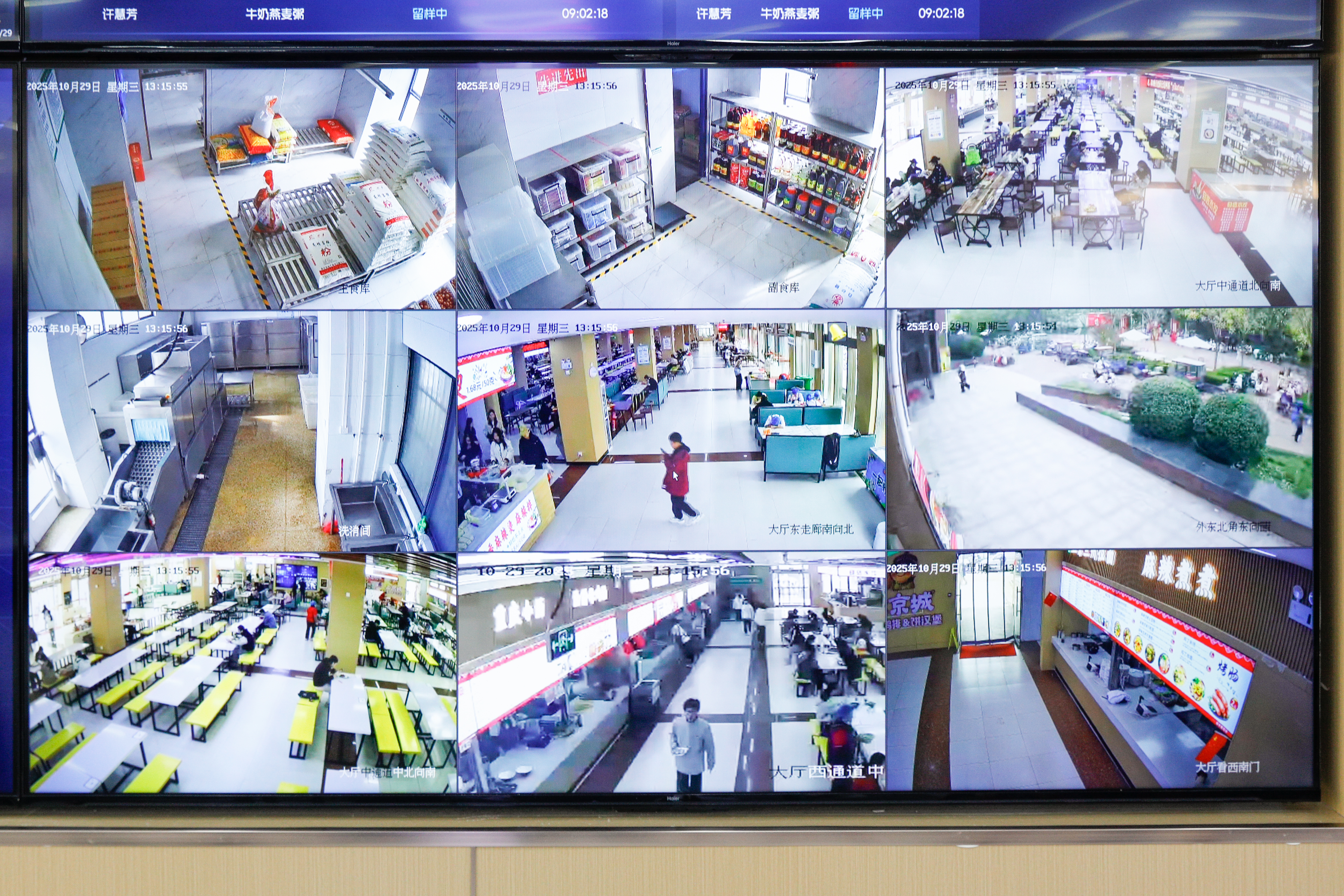 更让同学们感到新奇和安心的是,通过智慧大屏,后厨的实时景象从食材仓库、操作间到洗消间尽收眼底。这套“互联网+明厨亮灶”系统实现了24小时不间断运行,让传统的“闲人免进”后厨,变成了阳光透明的“可视化”厨房。每个食堂配备83个监控摄像头和先进的冷冻冷藏、消毒、留样等设备,确保食品加工过程全程公开,每一道菜品安全与卫生。