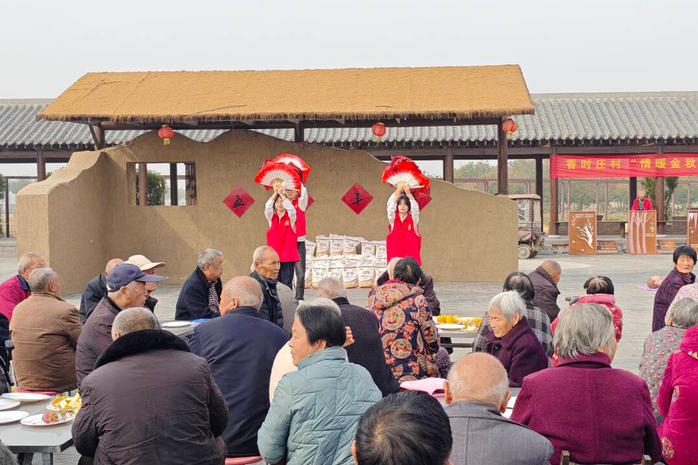 随着欢快的音乐响起,文艺表演环节正式拉开帷幕。志愿者们精心准备了歌曲、舞蹈、乐器演奏等丰富多彩的节目。他们带来的舞蹈《青春红》,以轻快的节奏、舒展的动作点燃现场气氛,引得台下掌声连连;红歌联唱环节,《我爱你中国》的旋律响起,村民们跟着轻声合唱,熟悉的旋律里满是共鸣;随后的古筝独奏《渔舟唱晚》,悠扬琴声与故里古意相融。表演过程中,志愿者们还主动与老人互动,邀请老人一同哼唱熟悉的歌曲,现场氛围温馨而热烈,老人们的脸上洋溢着幸福的笑容。