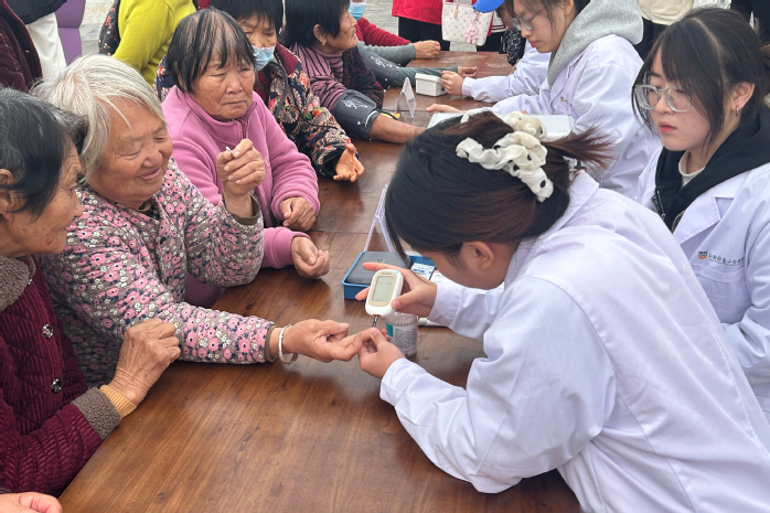 义诊服务区内,志愿者们早已备好血压计、血糖仪等医疗设备,为前来的老人提供免费血糖、血压检测服务。他们仔细为每位老人进行测量,详细询问其日常饮食、用药情况和身体状况,针对检测结果给出个性化的健康建议,提醒老人们注意饮食清淡、规律作息,定期监测身体指标,遇到不适及时就医。一次次细致的检查、一句句关切的问候,让老人们感受到了来自医学生志愿者的专业与温情。