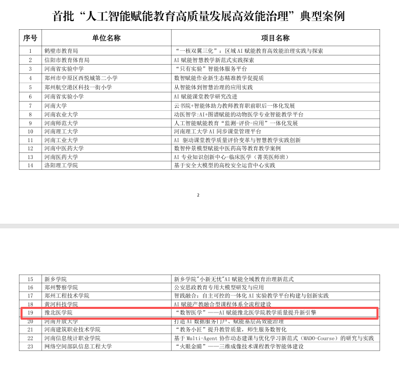 近日,河南省教育厅对首批“人工智能赋能教育高质量发展高效能治理”典型案例入选名单进行公示。由我校程巍老师主持申报的《“数智医学”——AI赋能豫北医学院教学质量提升新引擎》案例成功入围,跻身全省23项首批公示案例之列。