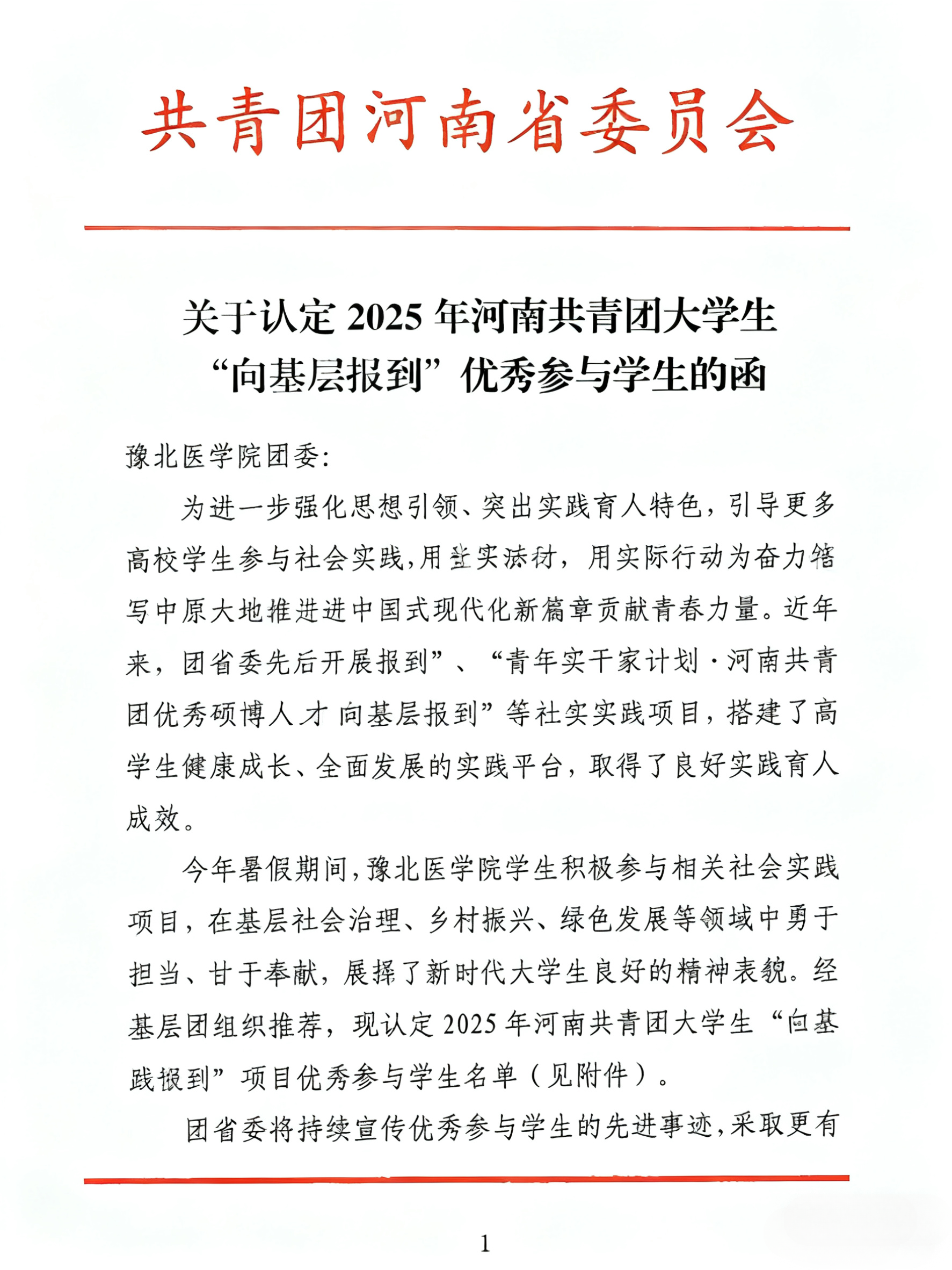 此次我校两名学子获评省级“向基层报到”项目优秀参与学生,既彰显了个人的卓越风采与责任担当,更是我校深耕实践育人工作结出的丰硕成果。学校长期以来高度重视学生社会实践能力的培养,依托暑期社会实践等活动深化育人成效,持续引导广大学子在扎根基层中砥砺品格、锤炼本领。未来,学校将以此次获奖为契机,进一步总结实践育人经验,加大对学生基层实践活动的支持力度,挖掘和宣传更多优秀学生典型,发挥榜样示范引领作用,引导广大青年学子以获奖学生为榜样,树立“扎根基层、建功立业”的理想信念,在基层实践的广阔天地中放飞青春梦想,为健康中国建设和中华民族伟大复兴贡献豫医智慧与青春力量。