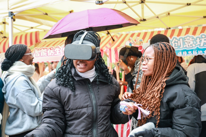 在闻德礼堂正门口,各个科创摊位前围满了学生。大家或体验VR,或与AI机器人互动,或在创意工坊中感受创新。志愿者们耐心讲解,鼓励探索。现场科技与创意交织,智慧与梦想激烈碰撞,热闹非凡。