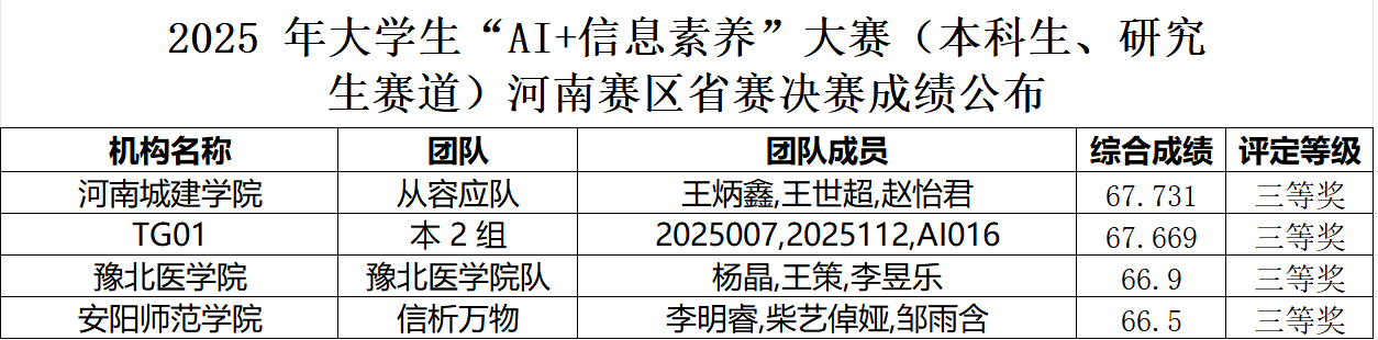 近日,由河南省教育厅高等教育处指导,河南省高等学校图书情报工作委员会,河南省高校图工委信息素养教育专业委员会等单位联合承办的2025年大学生“AI+信息素养”大赛河南赛区省级赛事落下帷幕。我校学子凭借出色表现,荣获省级三等奖。