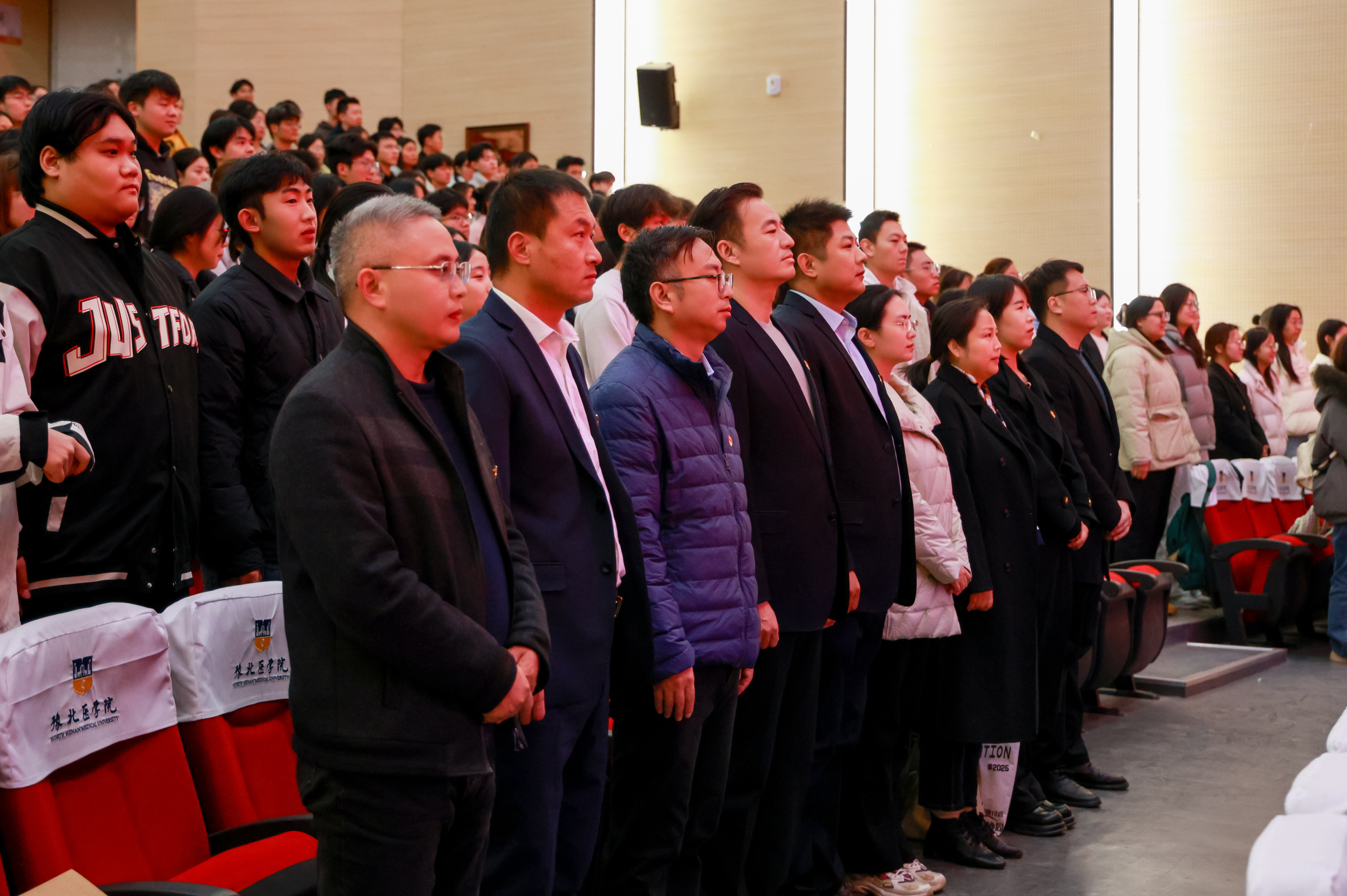 仪式在庄严的国歌声中拉开帷幕,全体师生肃立,激昂的旋律响彻礼堂,展现了青年学子昂扬向上的精神风貌和深厚的爱国情怀。