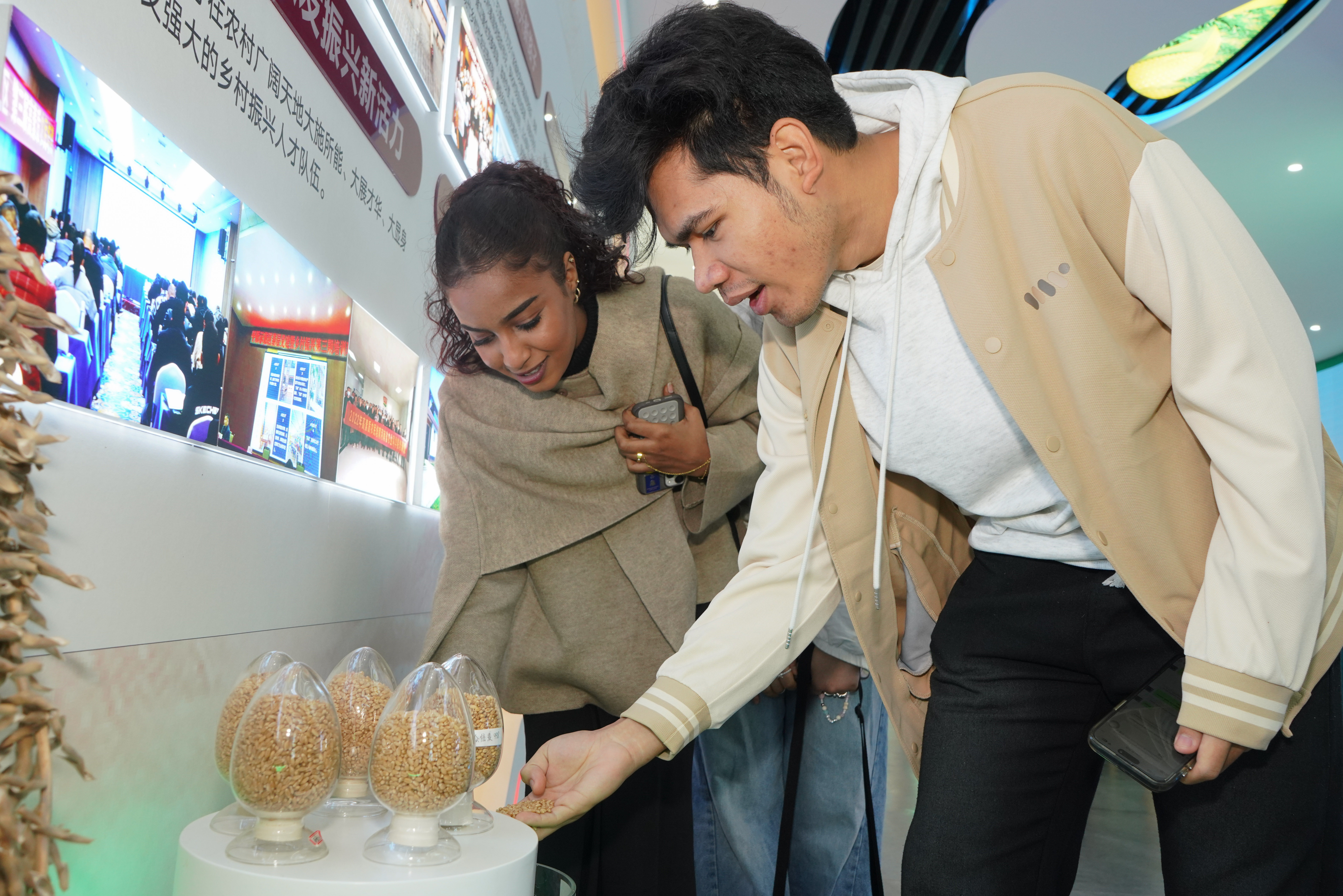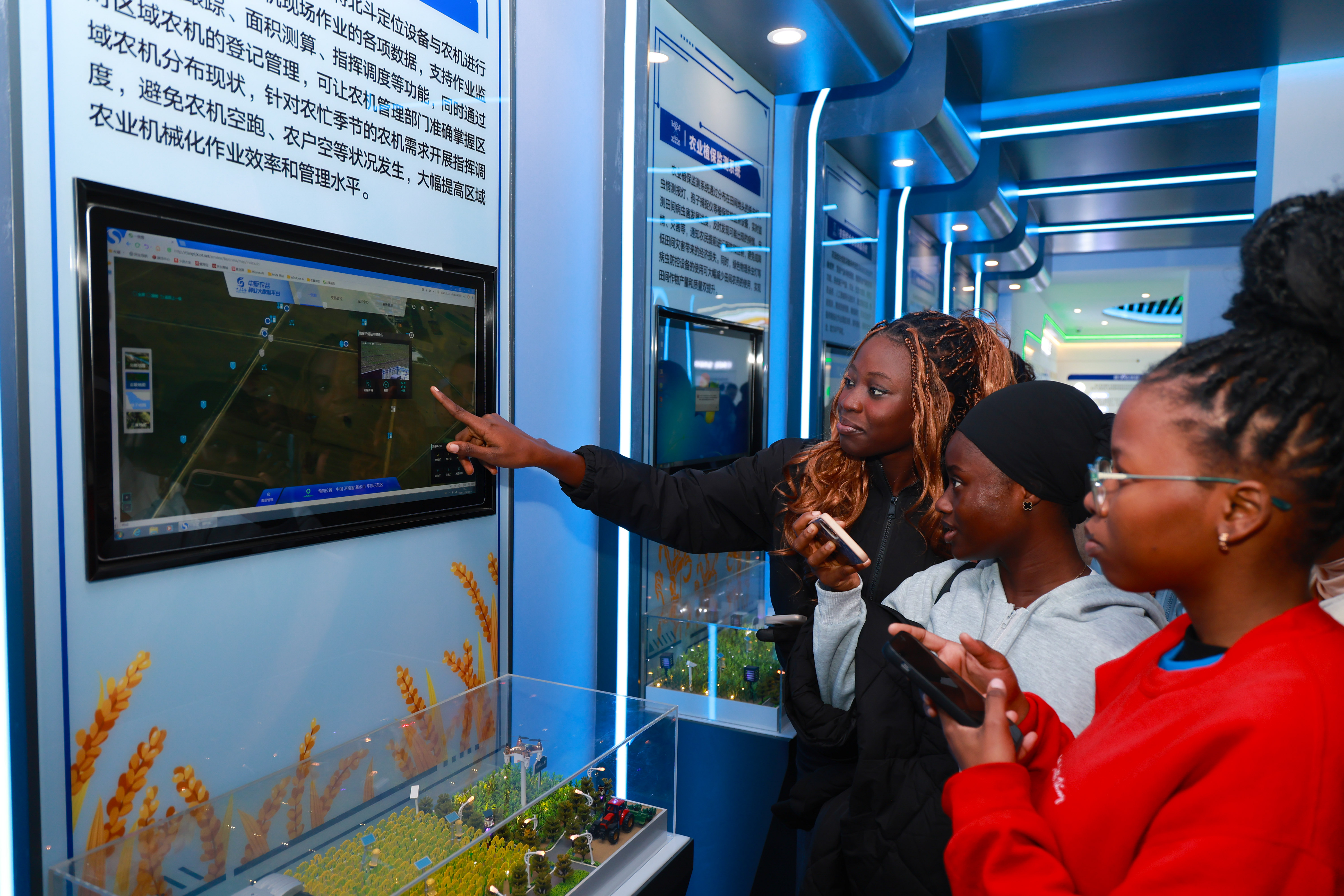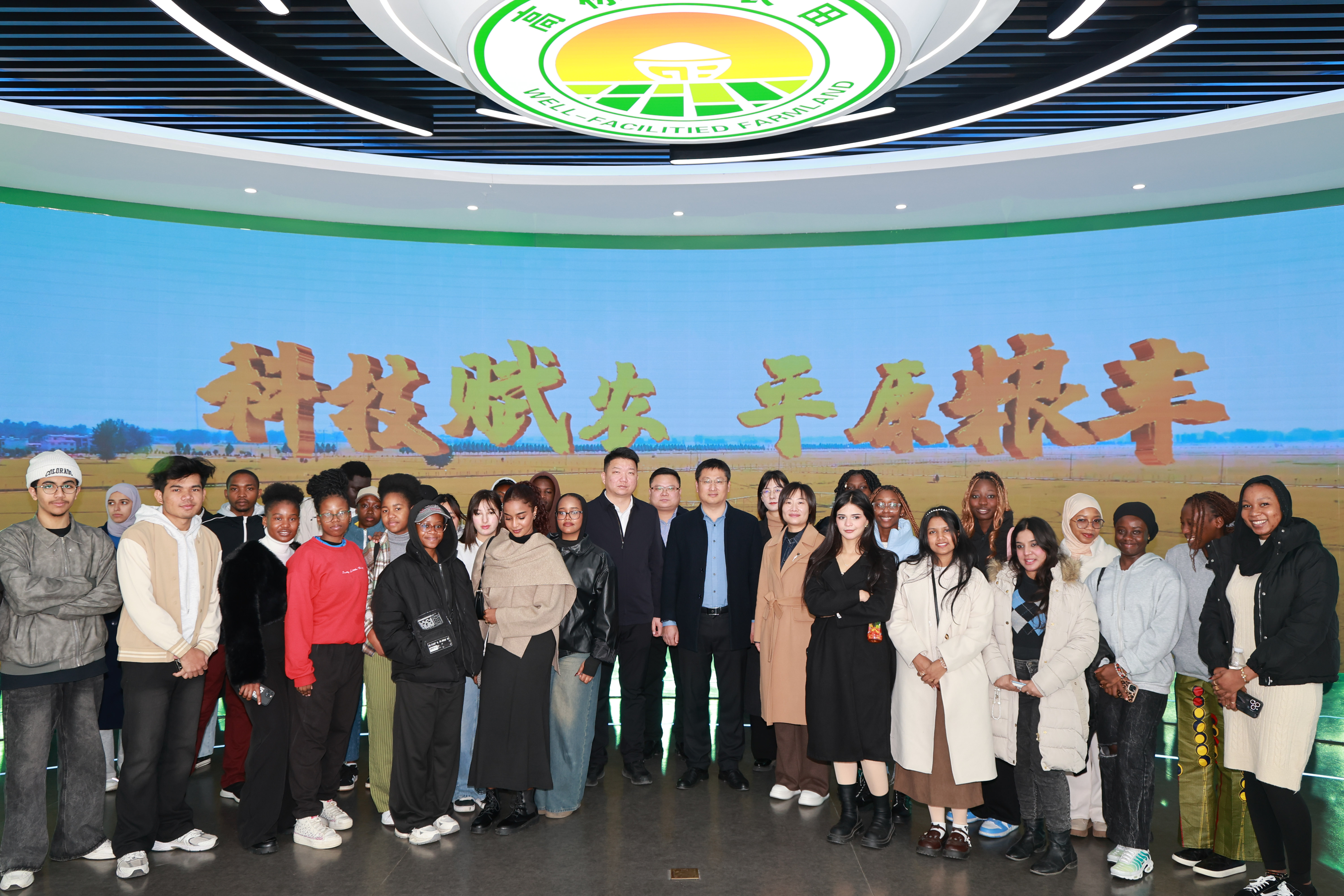 师生一行首先走进高标准示范田展厅,沉浸式体验“农业+数字技术”的融合成果。作为河南省推动粮食安全与乡村振兴的重要载体,这片集聚研发、推广与孵化功能的现代农业示范区,从智能农机精准作业到全产业链协同,从“新麦26”等突破性品种到绿色生产实践,全面展现了中国农业现代化的扎实成就。讲解人员的深入讲解,使国际学生们“把饭碗牢牢端在自己手中”所蕴含的中国道路与担当有了真切认知。