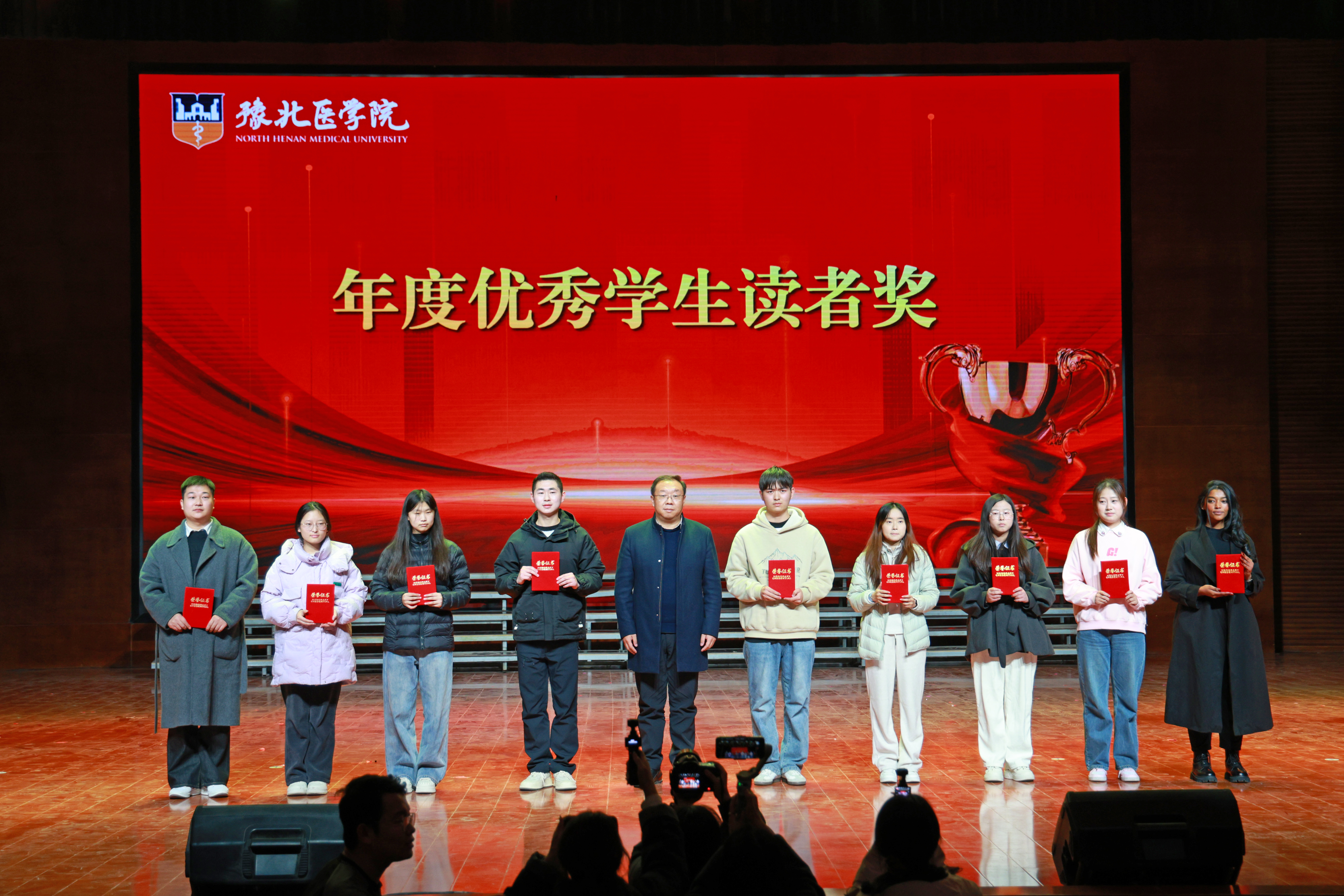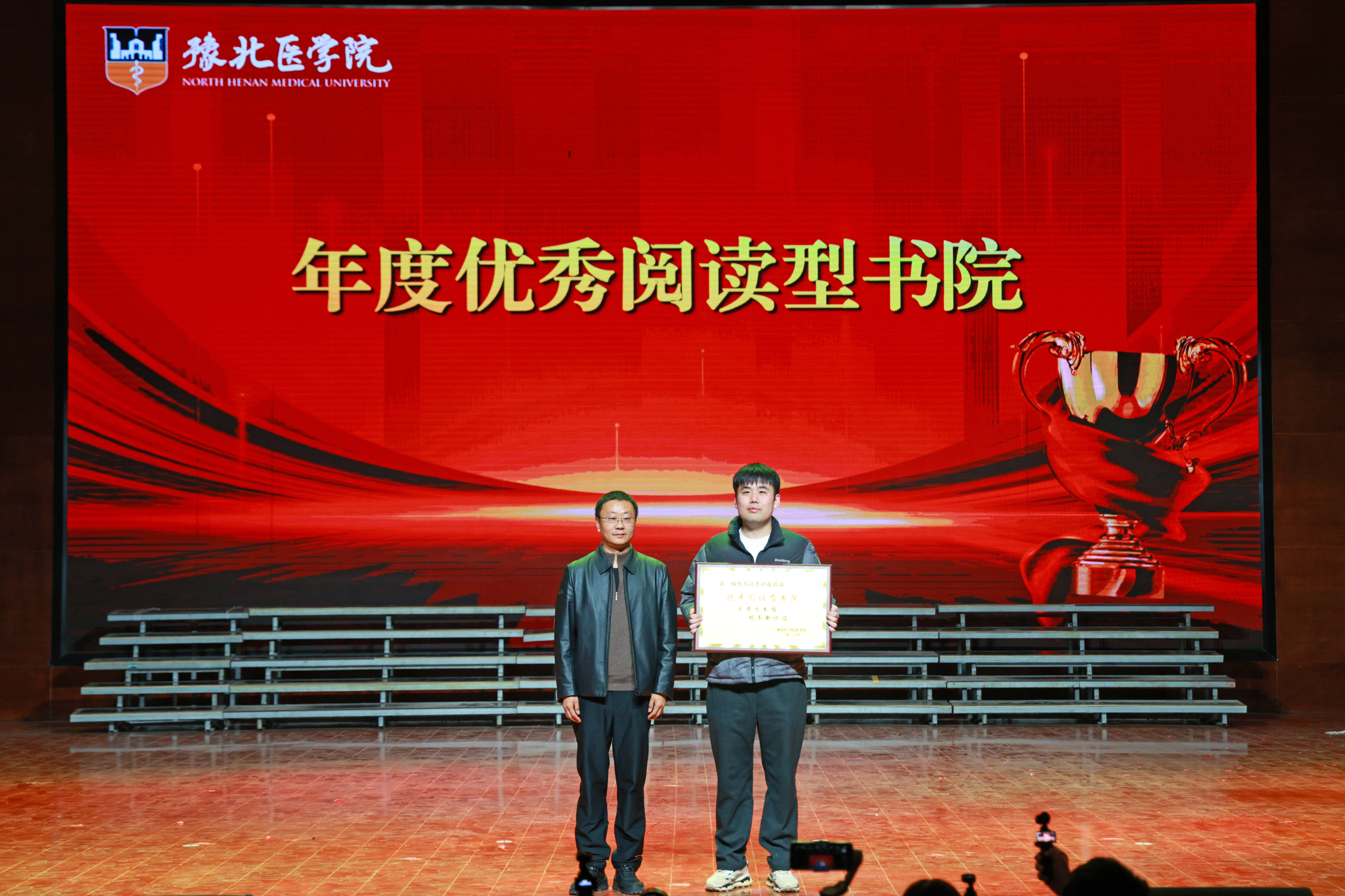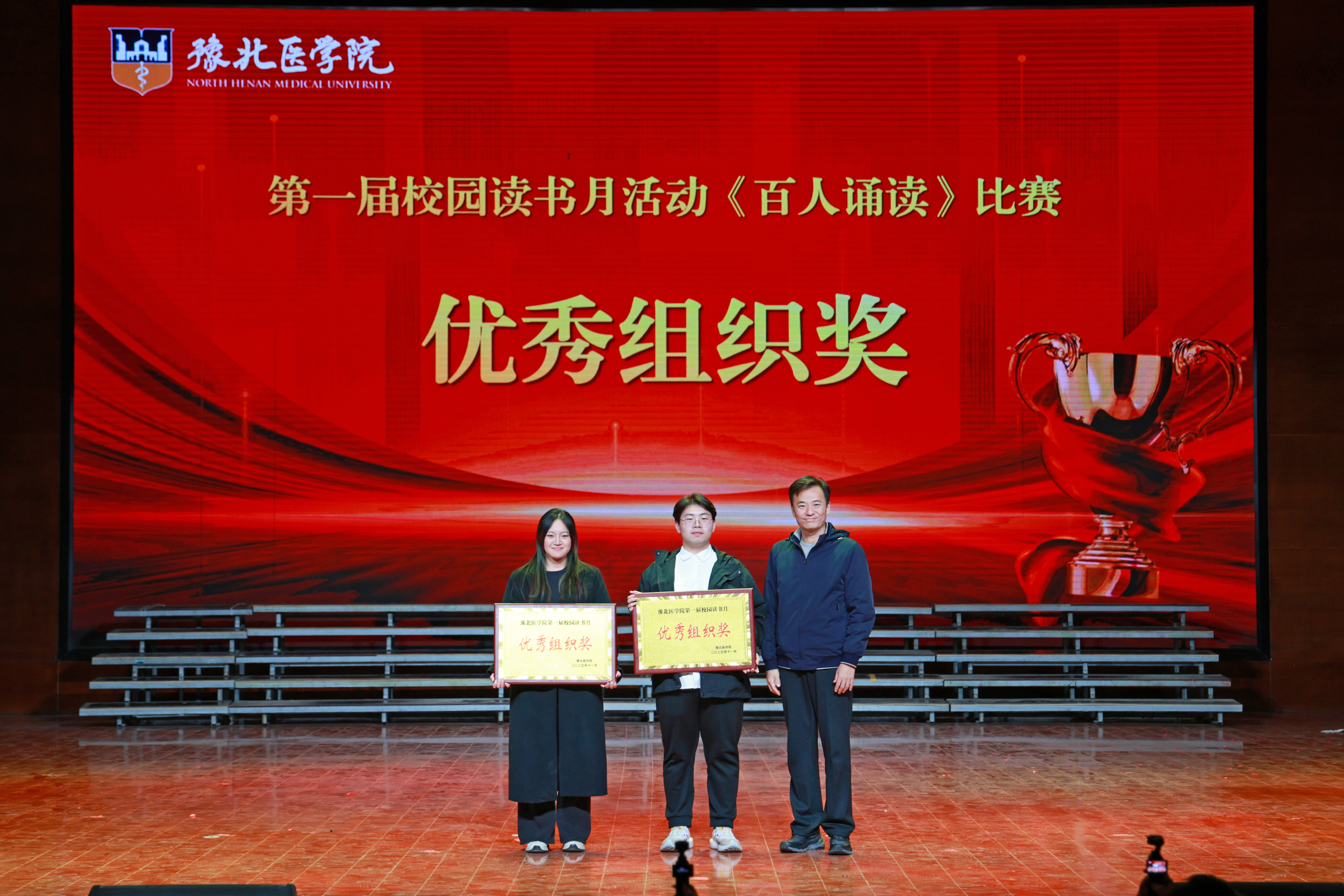 文脉延绵薪火传,书香育人润无声。为深化书香校园建设,厚植师生文化自信,引导青年在阅读中汲取成长力量赓续中华文脉,图书馆于10月29日起举办了为期一个月“墨卷含香承雅韵,书声明志赴新程”为主题的豫北医学院第一届校园读书月活动。11月27日晚,《百人诵读》比赛展演暨校园读书月活动闭幕式在闻德礼堂举行。我校副校长马波、顾欢莅临现场党委办公室主任、机关党委书记孙佳佳董事会办公室主任、校长办公室主任、发展规划处处长马素娟党委宣传部部长孙浩党委教师工作部副部长、人事处副处长、目标考核办公室副主任周瑞丹,党委学生工作部副部长、学生处副处长王林翮担任评委,各书院、院(部)负责人千余师生代表齐聚一堂,共同见证这场文化盛宴的圆满落幕。