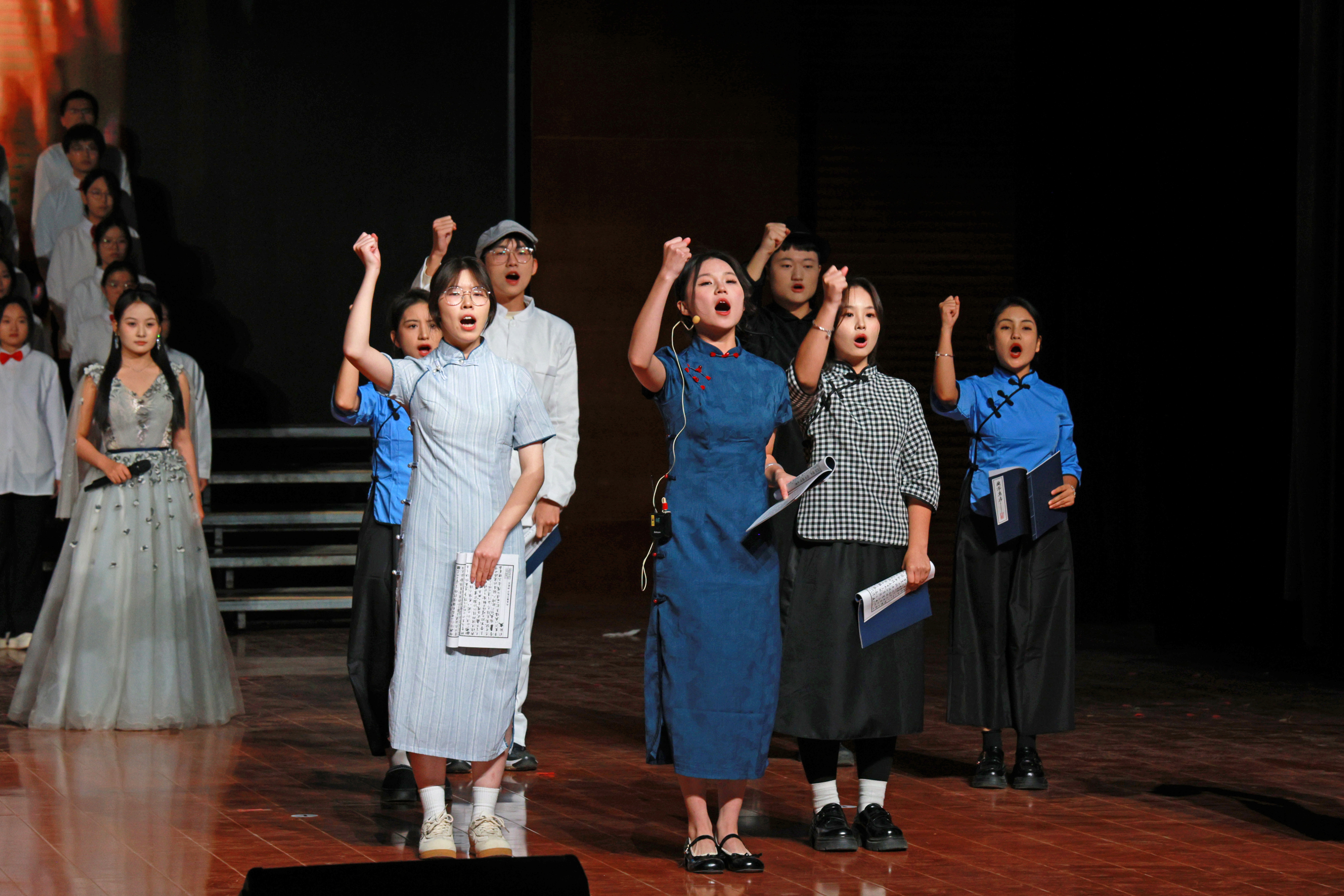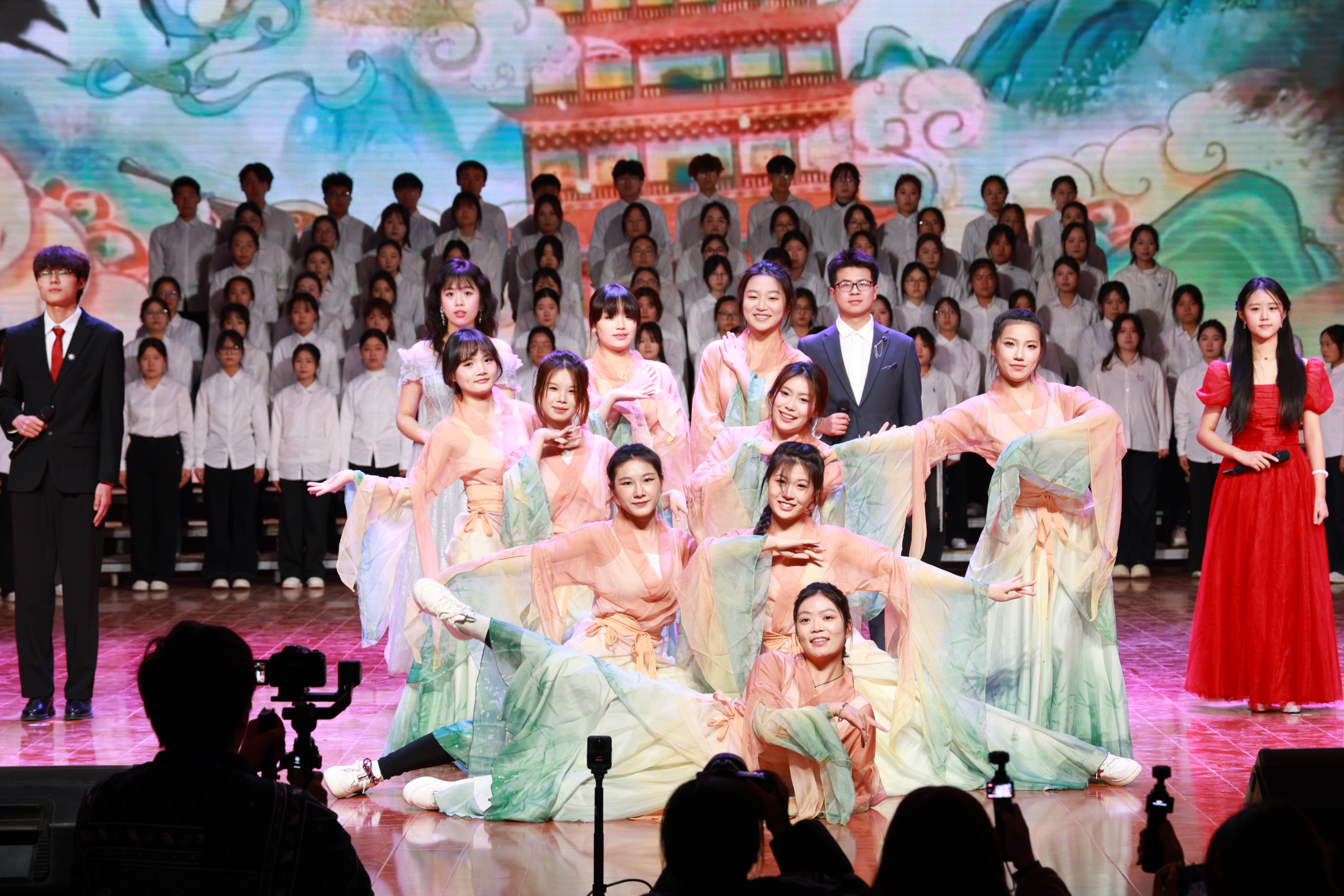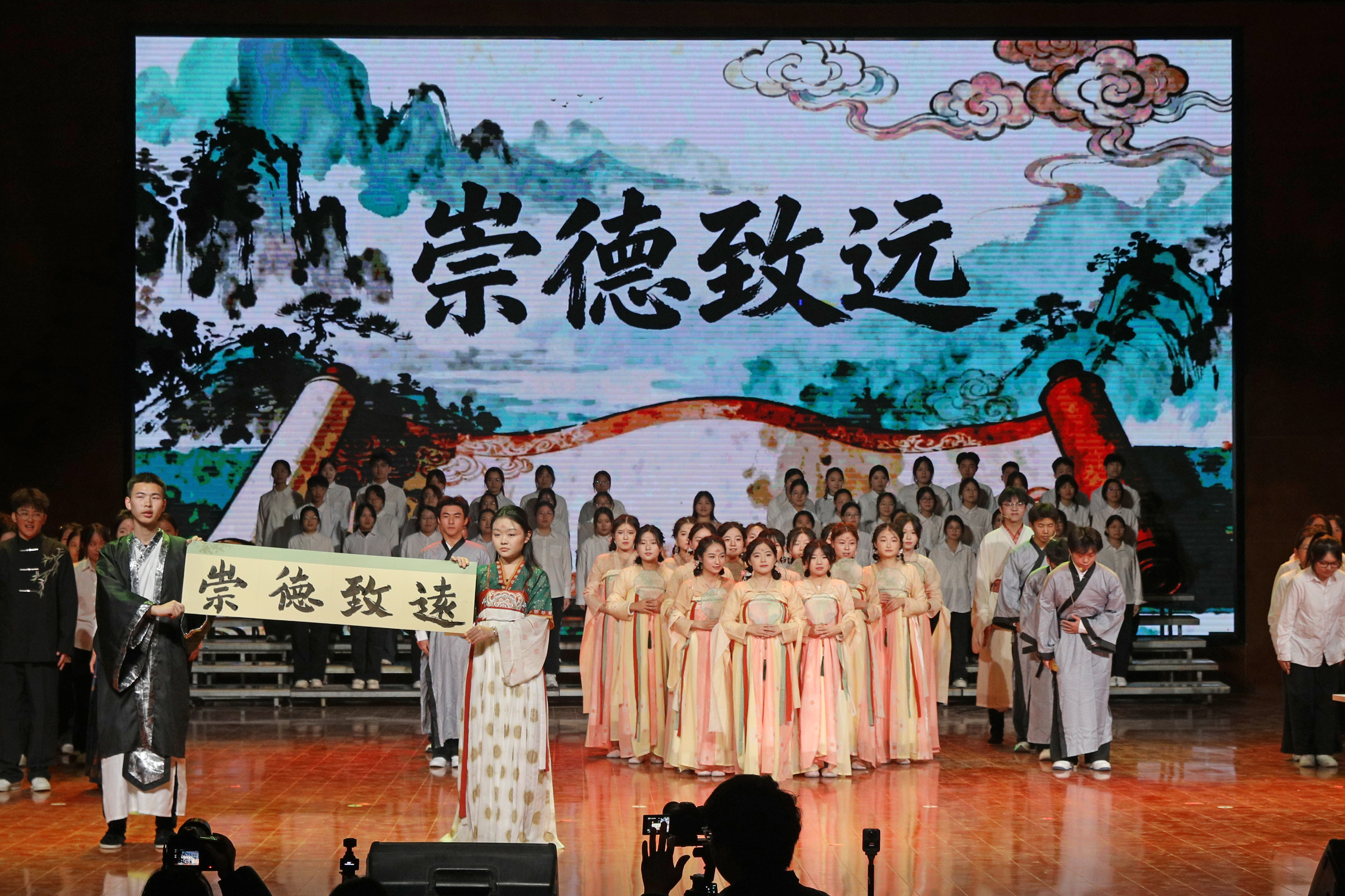 《百人诵读》比赛展演以“溯源诵响初心,展志歌咏未来”为主题,七个书院以书院名称为核心主题进行创作,通过百人诵读和艺术表演相结合的方式,诠释书院的初心和对未来的展望。日新书院溯文脉,立初心,以赤诚告白彰显集体凝聚力与使命,以求知笃行、奉献担当践行日新之训,以铿锵之声诠释青年承古开新、勇担时代使命的昂扬姿态;智行书院溯源历史长河,立足当下实践,展望未来征程,展现智行学子脚踏实地、勇于探索的精神风貌,书写无愧于时代的青春篇章;崇德书院“溯源、笃行、致远、践行”为脉络,诵“崇德向善”之训,展“笃学力行”之姿尽显书院育人本色与青年担当德馨书院从先贤圣言溯源德行根基,到医馆杏林、现代课堂传承仁心医德,以古今对话定格薪火相传的信念谱写德润人心、馨满人间动人华章羲和书院从经典篇章溯源羲和逐光的精神内核,从时代颂歌汲取躬身诵读的奋进力量,以青春之声奏响“诵典承脉、羲和逐光”的时代强音;仁智书院以“仁”“智”为精神底色,汲古润今,将千年诗韵与书院实景相融深刻解答了当代青年应如何书写仁智兼备的时代答卷;精诚书院融家国气韵、精诚底蕴与青春朝气,“以精诚赴使命,以青春护家国”的当代豪情,“精研不辍、赤诚不改”的青年自觉诠释得淋漓尽致。七支书院代表队的精彩演绎,让在场观众沉浸式感受到文字的温润力量与文化的深厚底蕴也让大家更加深刻理解了书院精神的丰富内涵和价值