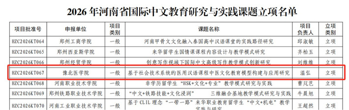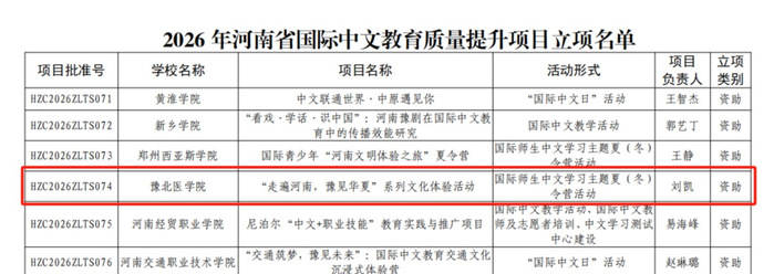 近日,河南省教育厅公布了2026河南省优质国际化课程等项目立项结果,我校再创佳绩,共有3个项目成功获批,包括2026年河南省优质国际化课程一项,2026 年河南省国际中文教育研究与实践课题一项2026 年河南省国际中文教育质量提升项目一项,彰显了我校在国际化教育领域持续深化的建设成效。