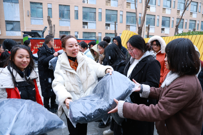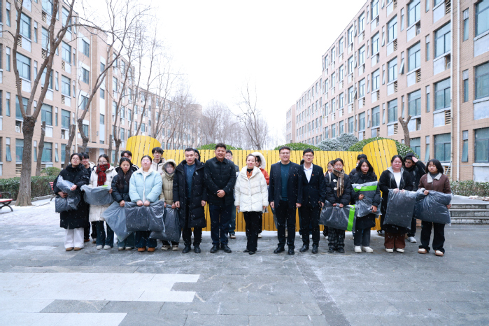 调研结束后,一场温馨的关怀活动随之展开。李琼校长与学生处处长张帆、副处长郝雷一同为家庭经济困难学生代表发放羽绒服,在恰逢寒冬初雪中为学生送去温暖。这份礼物不仅是物质上的支持,更承载着学校对学子们的深切关爱与鼓励。