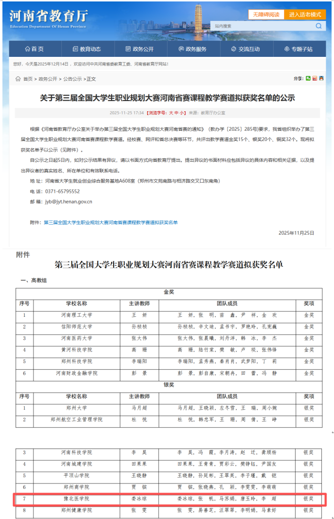 近日,由河南省教育厅主办的第三届全国大学生职业规划大赛河南省赛课程教学赛道决赛结果公布,我校娄冰琼、张帆、马苏娟、唐玉玲、李超教师团队凭借创新的课程设计和出色的现场表现,荣获高教组银奖,实现了我校在该项赛事的历史性突破。