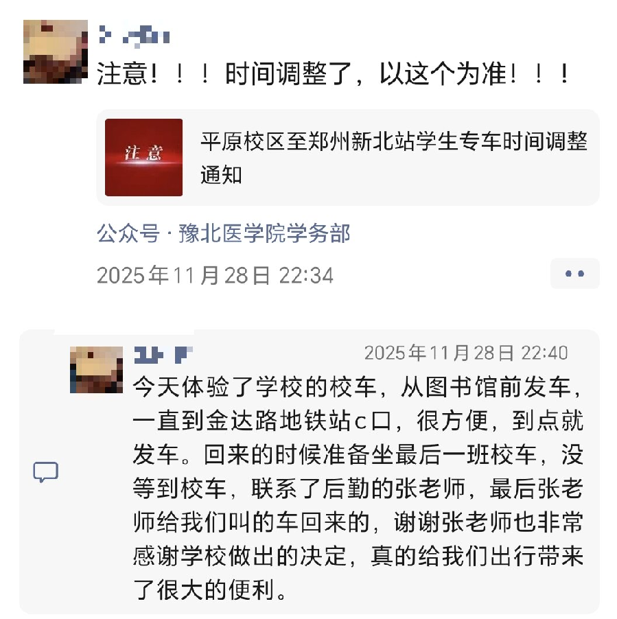 推行定制交通服务。聚焦学生出行的核心诉求,持续优化校园交通服务供给能力,后勤处已正式开通平原校区至郑州的专属学生大巴服务。该线路运行时间与节假日客流高峰精准适配,实现运力供给与出行需求的高效匹配;相关乘车班次、票务等详细信息,可通过后勤服务公众号查询了解。此次专属交通服务的开通,将为学生出行提供安全、便捷、高效的交通支撑,进一步完善校园出行服务体系。