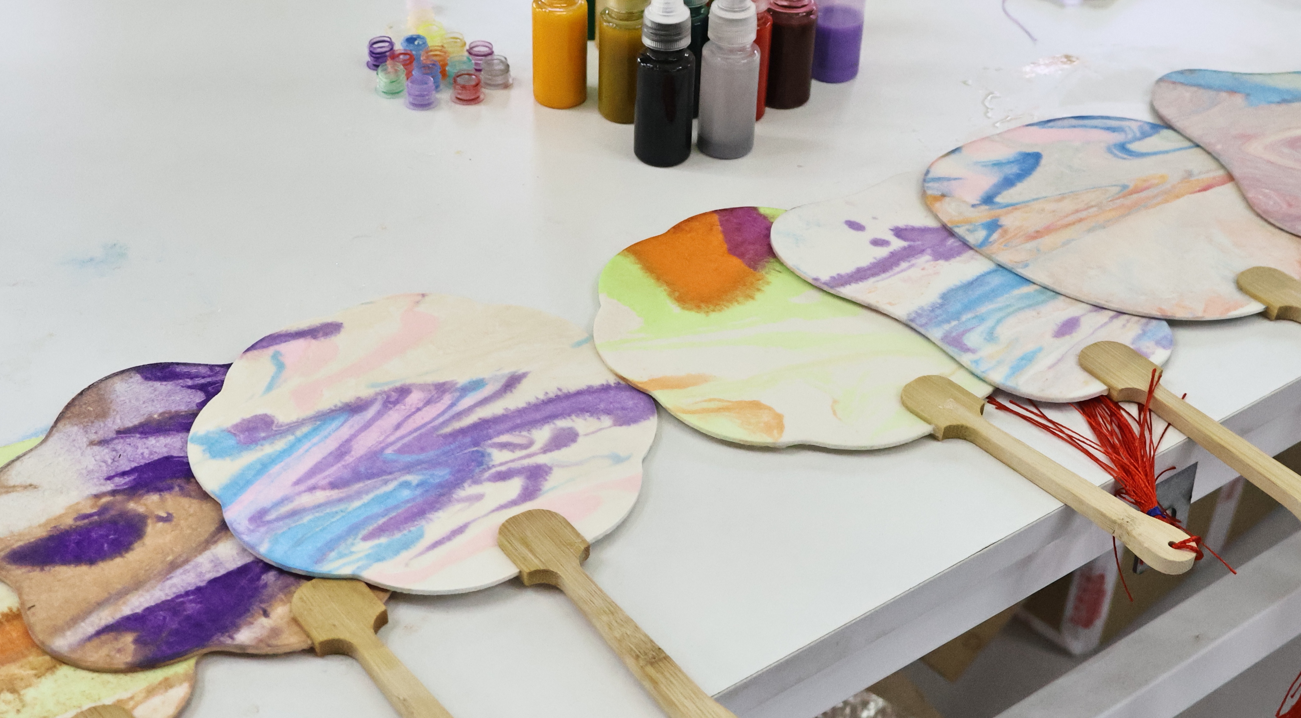 手工漆扇DIY区里,大家手执素扇,蘸取漆料,在扇面上勾勒出一幅幅独具匠心的图案。或绘山水之秀,或描花鸟之趣,一把把素扇在巧手下变成了精美的艺术品。福字书写区前,墨香阵阵,师生们挥毫泼墨,写下一幅幅饱含祝福的“福”字,将对新年的美好期许融入笔端。拓印明信片制作区更是人气满满,大家用工具蘸取颜料,在明信片上轻轻拓印,一张张承载着传统文化韵味的明信片跃然纸上,成为独属于这个冬至的珍贵纪念。