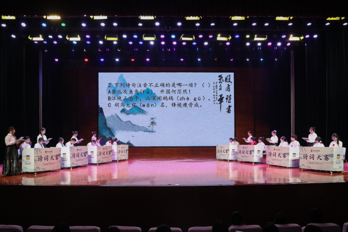 紧接着,第二轮“诗韵飞花·家国逐光”与第三轮“赤子情怀·超级飞花”轮番上阵,将比赛推向扣人心弦的高潮。当裁判宣布以“家国山河”为令词,擂台之上顿时“风起云涌”。来自崇德书院的选手任金缇信手拈来,“国破山河在,城春草木深”,悲慨深沉;其对手刘佳立即接上“白日依山尽,黄河入海流”,气象开阔。对决逐渐升温,“万里山河唐土地,千年魂魄晋英雄”“无限山河泪,谁言天地宽”……诗句如穿珠缀玉,不绝于耳。