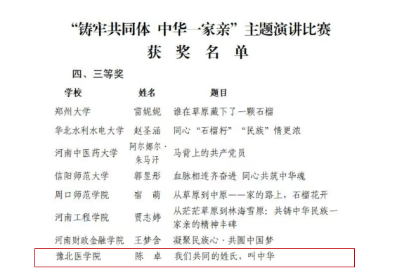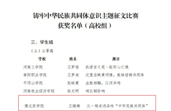 同月,在河南省第二十八届教育教学信息化交流活动中,学校《长征精神》《胚泡形成和植入》《光荣啊,中国共青团》3件作品获一等奖;《入海》《用爱坚守,造梦青春》《青春 热辣滚烫!》3件作品获二等奖;《轮椅的使用方法》《韶华岁月——留学生的“全”视界》《青春逢盛世奋斗正当时》《“医”路有你,一“研”为定》4件作品获三等奖。