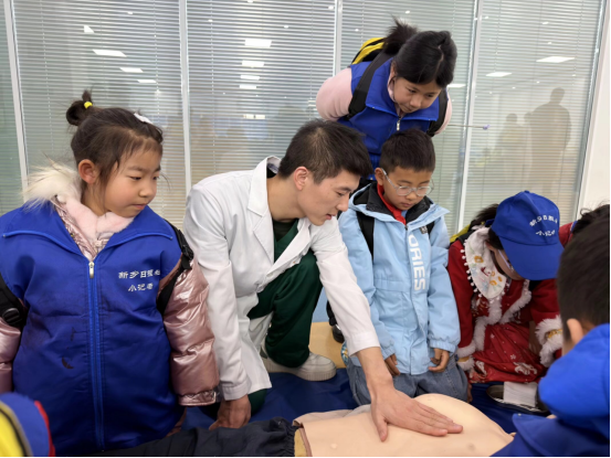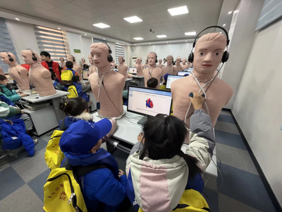 急救技能培训区成为当天的高潮。郭桂锦老师利用人体模型演示心肺复苏(CPR)的标准流程:“每分钟100–120次按压,深度5–6厘米,胸廓必须充分回弹。”小记者们分组上前实操,虽然力气尚小,但动作格外认真。学生志愿者穿梭其间,耐心纠正细节:“手臂要伸直,借助上半身的力量。”