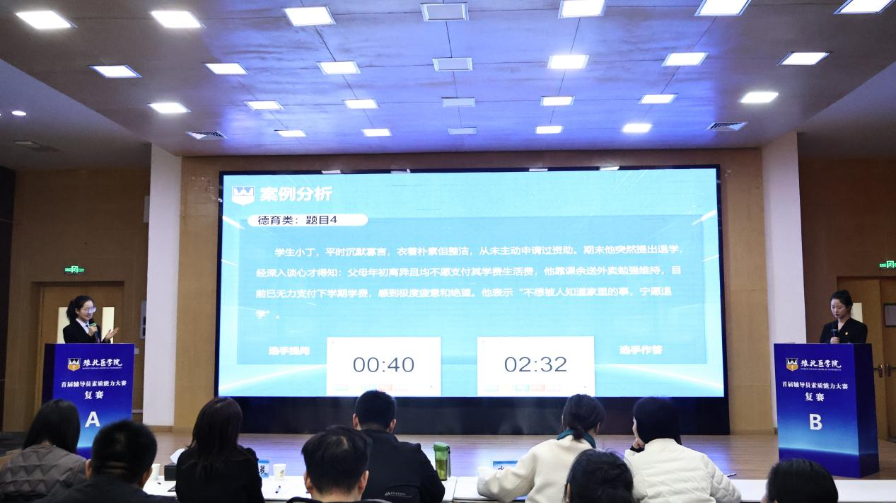 12月25日下午,复赛在行政楼报告厅举行。复赛形式为案例分析,重点考察辅导员综合运用理论分析问题、研判问题、解决问题和教育引导学生的能力。