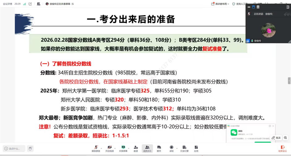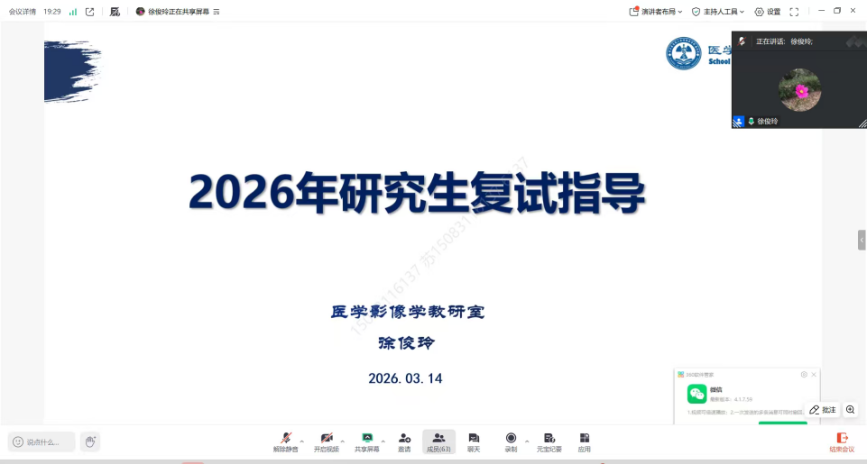 史大鹏长期深耕医学影像诊断领域,兼具丰富的临床实践与研究生培养经验,他结合自身参与研究生招生复试的经历,鼓励学子坚定备考信心,以严谨认真的态度做好复试准备,展现影像专业学子的专业素养与精神风貌。徐俊玲作为核医学领域的学科带头人,结合自身科研与教学经验,针对影像专业复试中的科研潜力考察等重点内容给出具体建议,强调了复试中专业素养、逻辑思维和细节礼仪的重要性,并分享了自身指导研究生的心得,为学子搭建起理论与实践衔接的桥梁。
