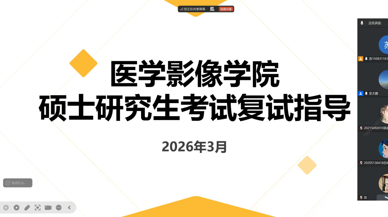 作为医学影像领域的权威专家,史大鹏与徐俊玲结合自身多年研究生招生复试评审经验、学科建设实践及人才培养心得,围绕影像专业考研复试的核心要点展开系统讲解。讲座中,两位教授聚焦复试全流程,从复试流程拆解、评分标准解读、专业问答技巧、面试礼仪规范等关键环节入手,用通俗务实的语言拆解应试难点,结合影像专业特色,重点分析了复试中专业知识考察的侧重点的和答题逻辑,提醒学子既要夯实专业基础,也要注重临床思维与表达能力的展现,避免陷入答题误区。