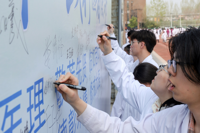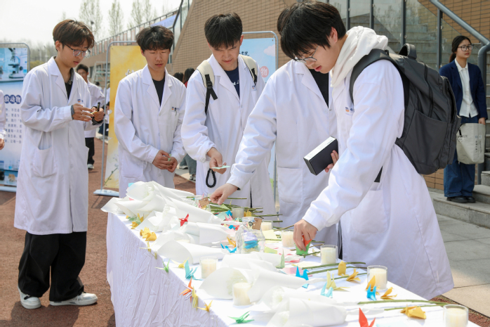 宣誓仪式落下帷幕后,随即开展大体老师致敬实践活动。学生代表手捧鲜花与亲手折叠的心愿千纸鹤,向大体老师敬献,每一朵鲜花都承载着感恩,每一只千纸鹤都寄托着敬意;随后,学子们肃立默哀,表达对大体老师的深切缅怀。在“我想对他说”签名环节,学子们有序在签名墙上签名,将想对大体老师说的心里话郑重书写在墙上,诉说敬畏、感恩与践行医者使命的承诺。此外,活动还布置了课外延伸任务,引导学子课后给大体老师写一封信,将内心的敬意与感悟诉诸笔端,让对大体老师的感恩与敬畏真正融入日常,深化生命教育成效。