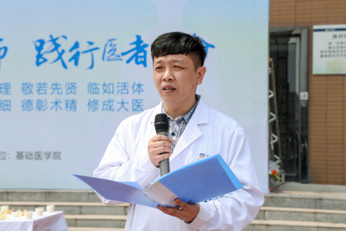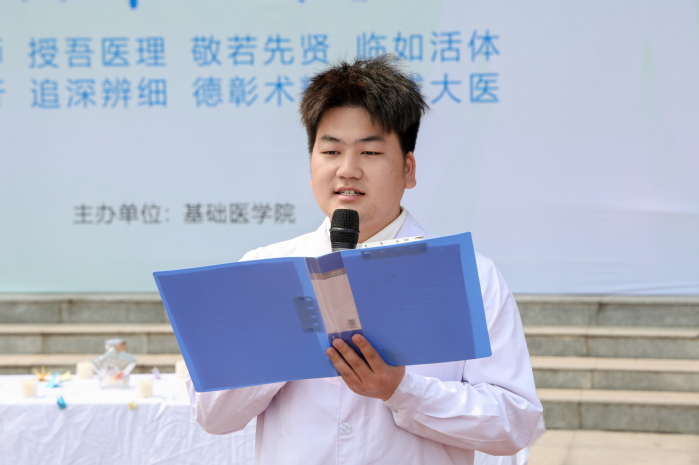 誓言传承环节,两场宣誓仪式层层递进,凝聚守护生命的青春力量,彰显医学担当。首先,由解剖学教师代表领誓,全体学子重温解剖学誓言:“无言良师、授吾医理、敬若先贤、临如活体、正心恭行、追深辨细、德彰术精、修成大医”,誓言铿锵,字字千钧,传递着对大体老师的敬畏与学好解剖学的坚定决心;随后,由学生代表领誓,全体学子身着白大褂,肃立重温医学生誓词,“健康所系,性命相托”的誓言响彻全场,将对生命共同体的敬畏,转化为学医行医的责任与动力,坚定了“救死扶伤、不辞艰辛”的医者信念。