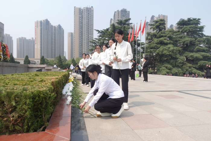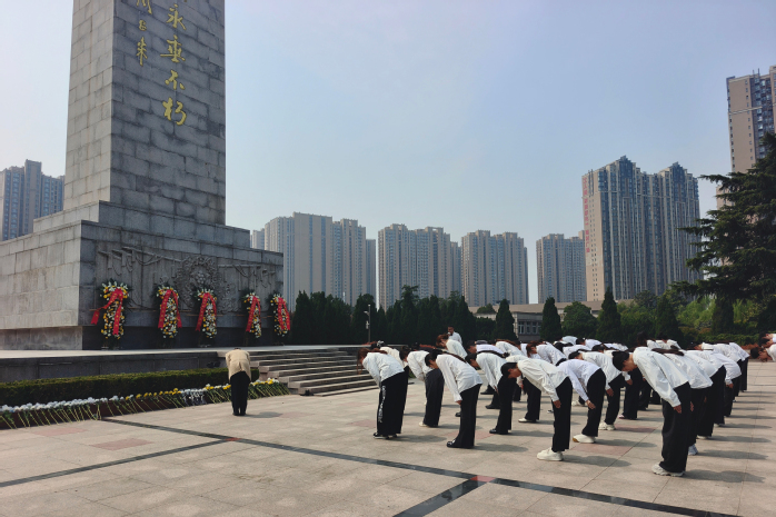 3月31日,师生党员代表前往郑州烈士陵园,开展“缅怀英烈志 共铸中华魂”清明祭扫活动。在庄严肃穆的烈士纪念碑前,全体党员整齐列队,神情凝重,手持一枝枝素雅的花朵,缓缓走向纪念碑,敬献于碑前,肃立默哀,向为民族独立、人民解放和国家富强英勇献身的革命先烈致以最深切的悼念。随后,全体党员面向鲜红党旗,高举右拳,重温入党誓词,铿锵誓言在陵园上空久久回荡,进一步强化了党员的宗旨意识与使命担当。