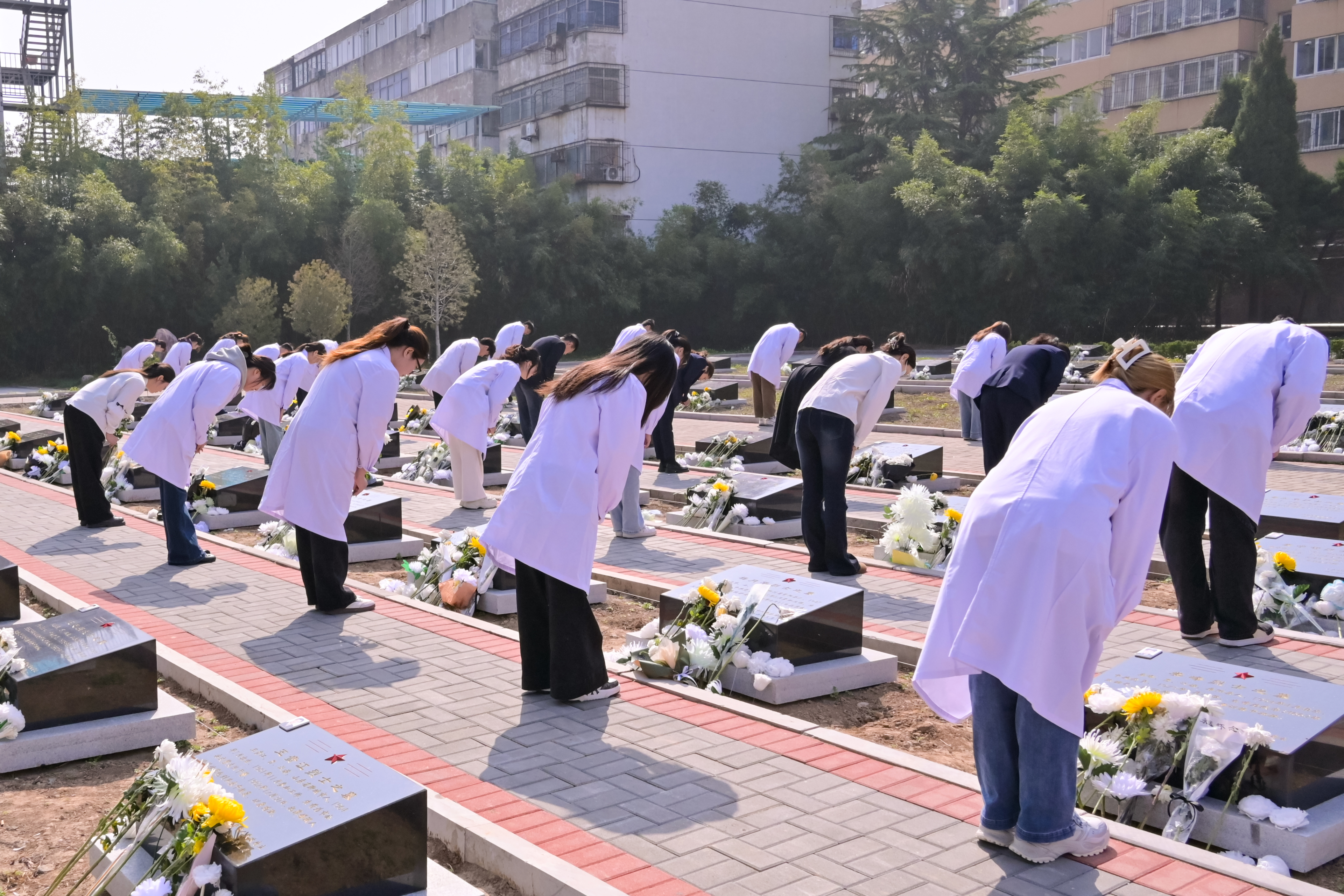 祭奠仪式结束后,师生们手持白菊,有序步入烈士墓区。在庄严肃穆的氛围中,全体人员肃立墓前,静默致哀、鞠躬致敬,朵朵白菊承载着跨越时空的思念,映照出新时代青年医者心中坚定的理想信仰。