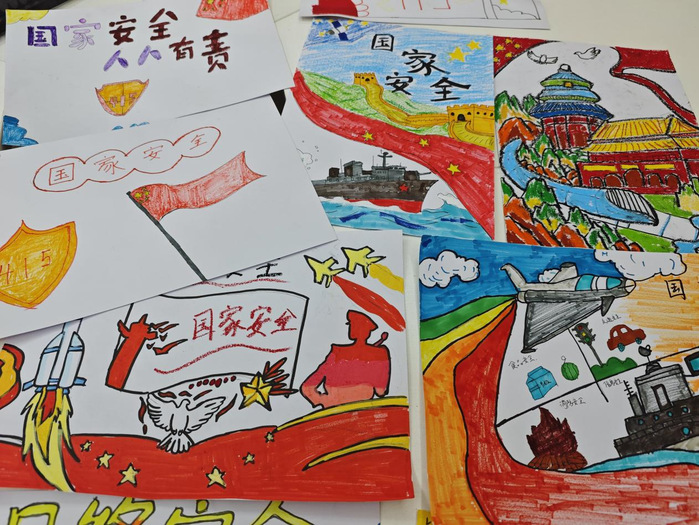 活动上半场,老师简要介绍了国家安全的核心领域,并提供了“界碑”“数据锁”“绿水青山”“防护盾”等创作关键词。随后,同学们拿起油画棒,在轻松而专注的氛围中自由创作。有的同学画下巍峨的边境线与飘扬的国旗,表达对国土安全的敬意;有的同学用锁链与代码元素勾勒“网络安全防线”;还有同学以银杏、碧水、飞鸟为意象,传递生态安全的理念。