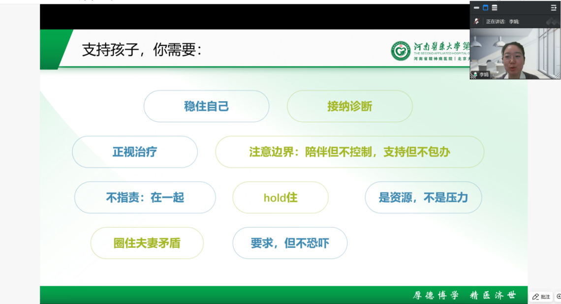 本次公开课以“做孩子的心灵后盾:读懂大学阶段常见心理信号”为主题,紧扣家长核心困惑,系统拆解大学生心理异常识别、科学就医误区、亲子沟通技巧及家庭支持策略等核心内容。李娟博士首先从身体、言语、情绪、认知、行为五大维度,讲解大学生心理异常典型信号,指导家长从时间、强度等六方面快速判断,区分正常情绪与异常心理,破除认知误区;其次,针对就诊登记、诊断、用药及副作用等家长关心的问题,逐一细致解答,破除诊疗偏见、消除就医顾虑;随后重点讲解家庭支持与亲子沟通方法,指导家长用“STOP技术”管控自身情绪,同时借助非暴力沟通四步法开展高效沟通,做到陪伴不控制、支持不包办;最后,李娟博士介绍学校与河南医药大学第二附属医院建立的心理危机转介绿色通道,为学生寻求专业诊疗提供便捷路径,助力学生及时获得专业支持,切实为大学生心理健康保驾护航。