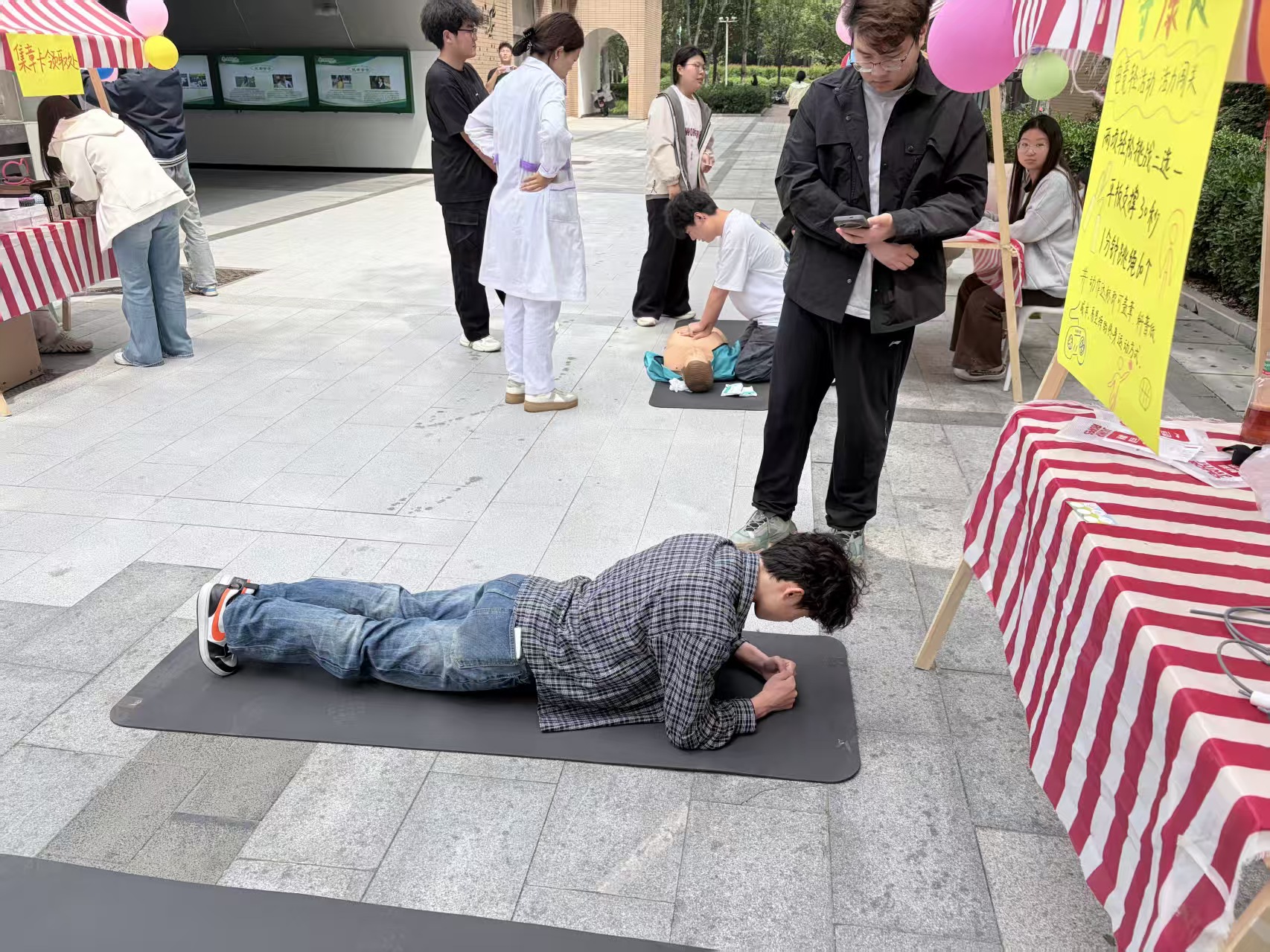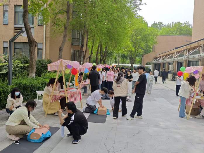 “持仁心——心肺复苏极速挑战”摊位前专业医护志愿者现场手把手教学,从标准手势、按压深度到节奏把控,细致拆解“黄金4分钟”急救技巧。同学们围在模拟人旁认真听讲、踊跃上手练习,一遍遍纠正动作、反复实操,轻松掌握实用急救技能,专业医护志愿者亲临现场,完整示范心肺复苏操作全流程,细致拆解每一项急救关键要点,一步步耐心指导同学们在专业模拟人上精准练习胸外按压的正确位置、标准按压深度与合理按压频率。同学们全神贯注观摩学习、亲手实操演练,在规范有序的实操练习中,熟练掌握“黄金4分钟”急救核心知识与实用操作技巧,切实提升自身突发情况应急处置能力,人人都化身身边的安全小卫士。